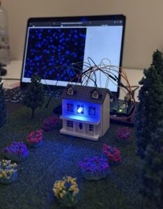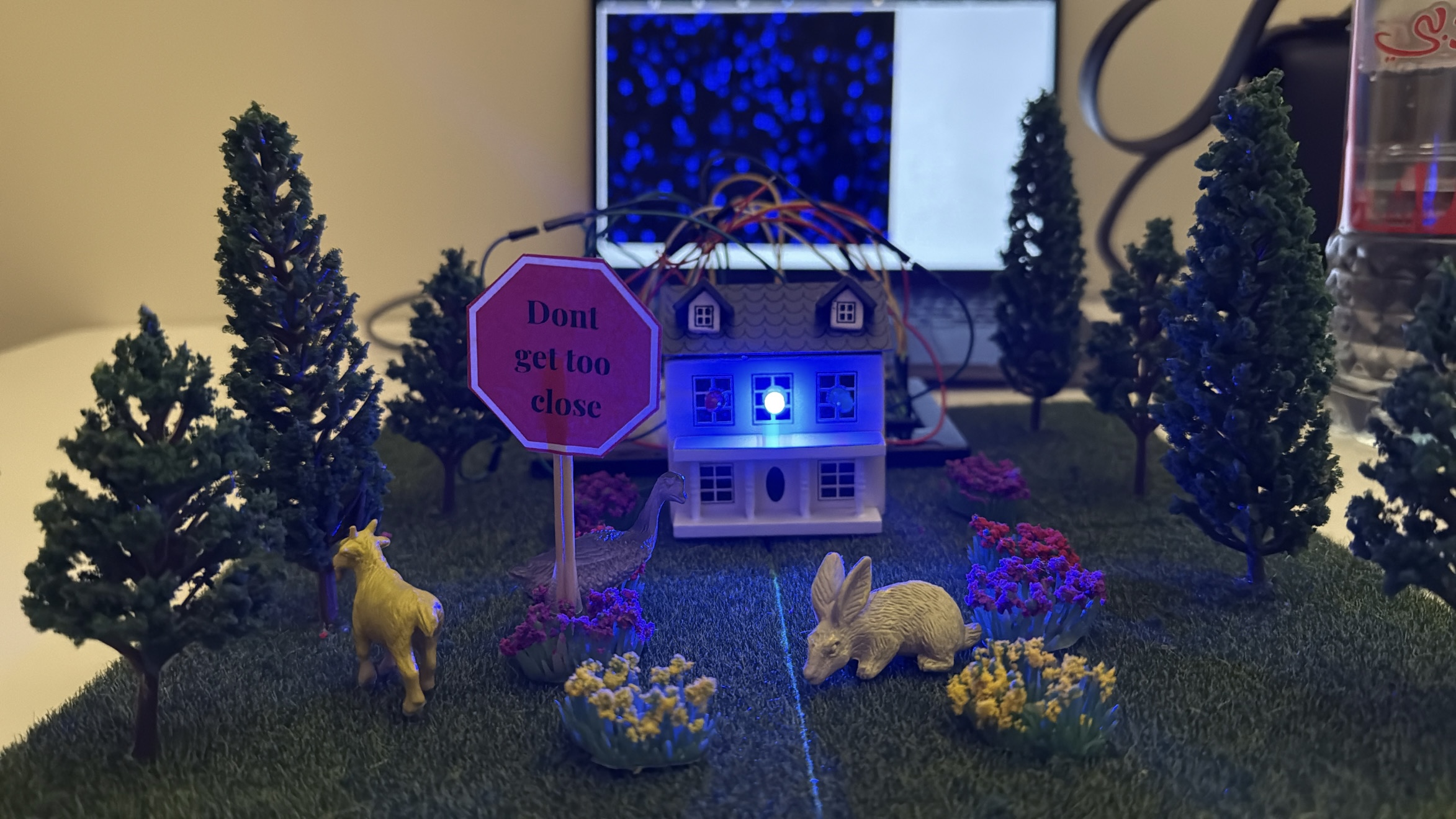 My final project is the Motion-Activated Mini Garden/farm Visualizer, an interactive installation that responds to movement and presence using an ultrasonic sensor. – house and the garden I built . When someone approaches the garden, the LEDs light up based on proximity—closer movement causes brighter, more vibrant lights, while standing farther away results in dimmer, calmer effects.