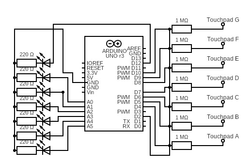 Hardware: Arduino Uno, copper tape, 1MΩ resistors, jumper wires, 7 LEDs