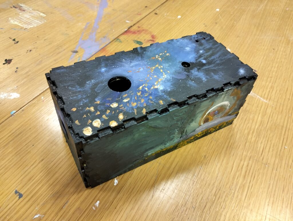 • I built a full installation setup with a laser cut box, arcade button, and headphones, which makes the project feel complete.