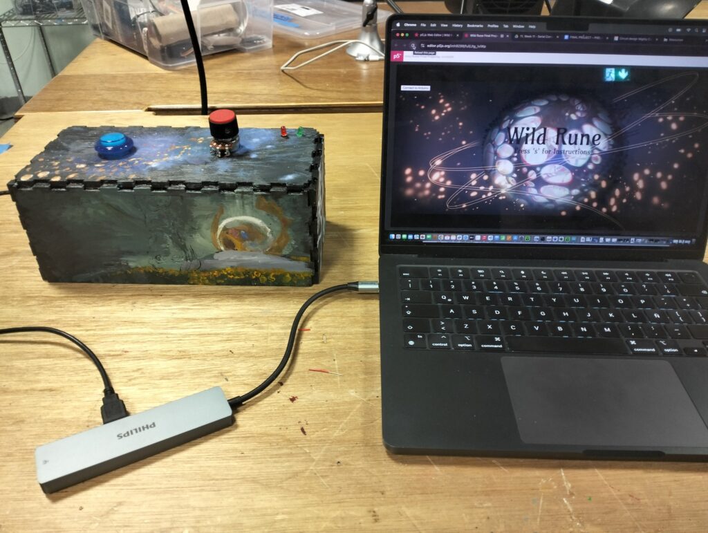 1. It listens to the arcade button. When the user presses the button, Arduino sends “PRESSED” to p5.js. This starts the experience.