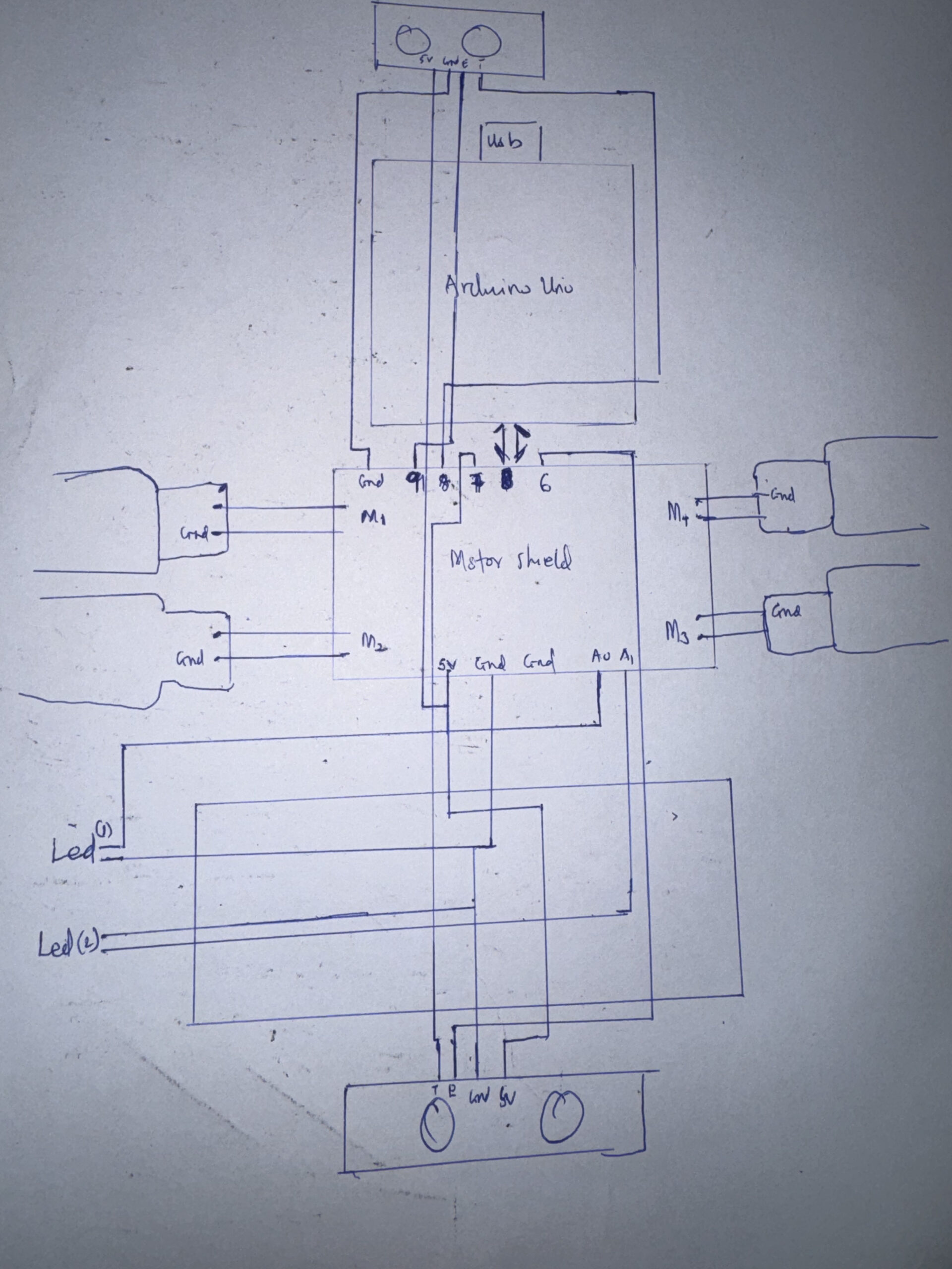 Below is the full Arduino sketch, which includes motor control, safety checks, distance reading, and serial command handling.