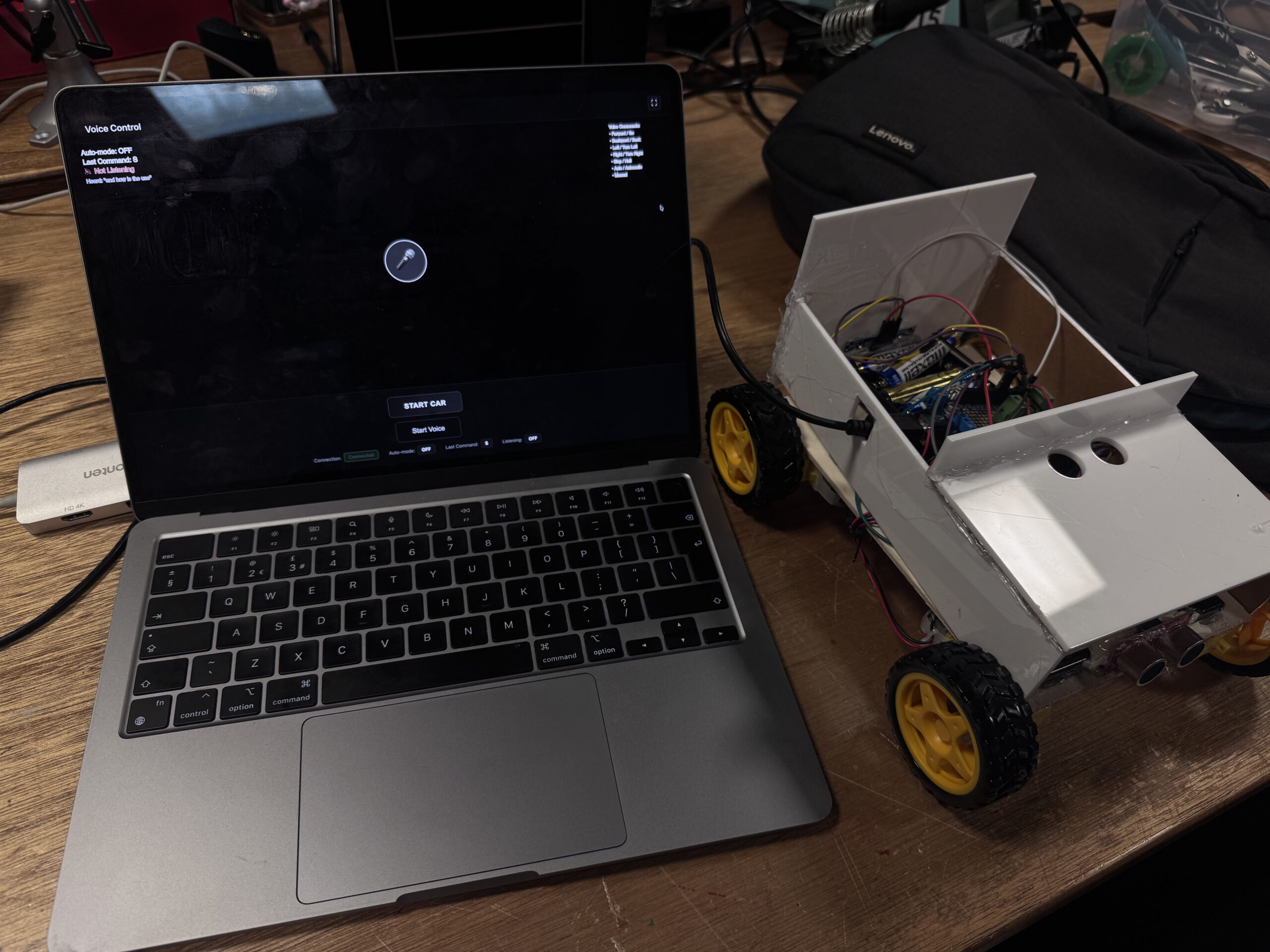 This project is a small car that connects to my laptop with a USB cable. Instead of using buttons, I control it with my voice. I say simple words like “forward,” “left,” “right,” “back,” or “stop,” and the car moves instantly. There is also an auto mode that lets the car drive itself while the screen shows what it’s doing.