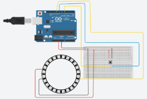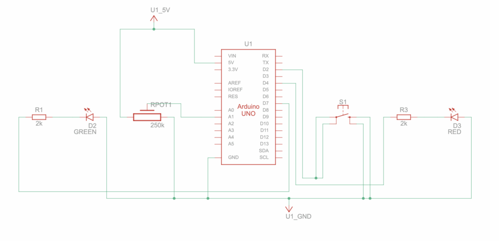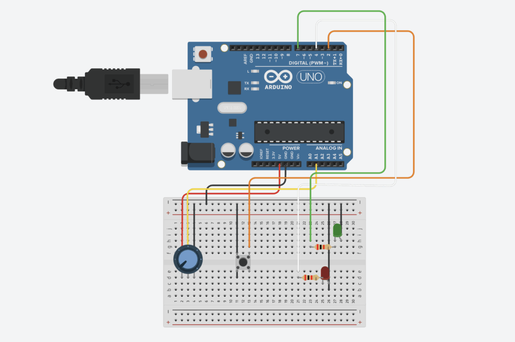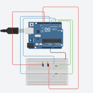 The Arduino handles three primary responsibilities within the system. First, it continuously reads the analog input from the potentiometer and sends the corresponding values to the p5.js sketch, ensuring smooth and accurate control of the rotation mechanic. Second, it receives beat indicators from p5.js sent as a boolean (either a 0 or 1). It uses these signals to toggle between the red and green LEDs, creating a synchronized lighting effect that reacts to the music. Finally, it maintains a consistent serial handshake with p5.js, ensuring stable, real-time communication between the physical hardware and the digital interface.