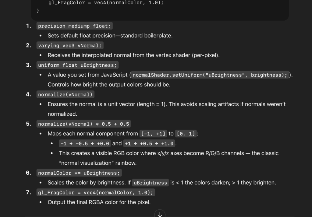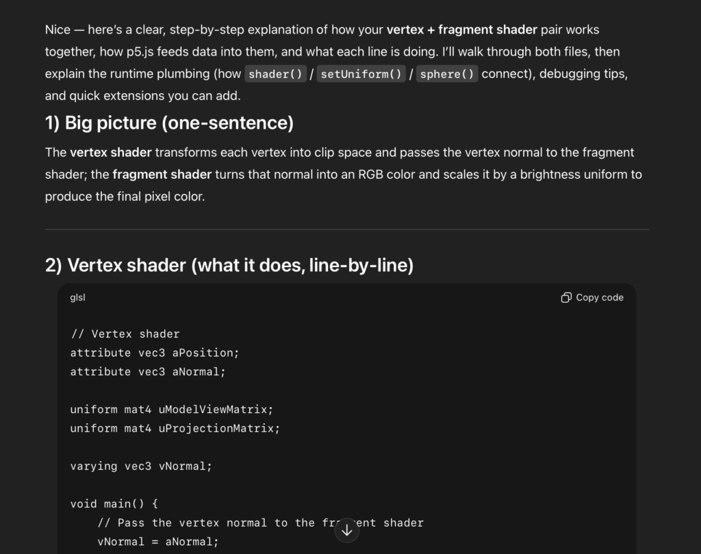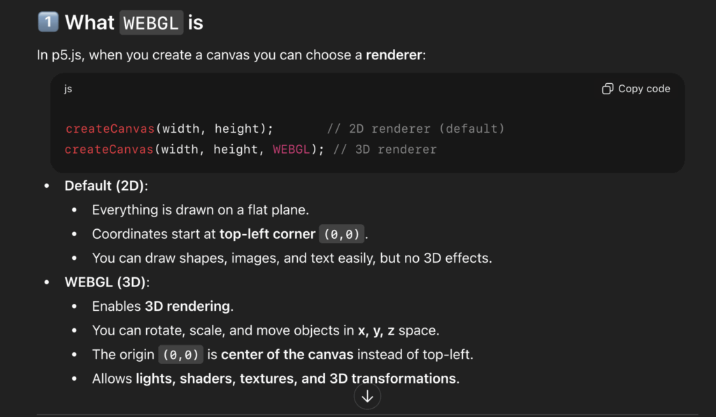 I used AI throughout the project as a learning tool. It helped me understand how the Handpose model in the ml5.js library works and how to map finger positions to gestures. I was also very interested in WEBGL from the first day of the Intro to IM class. If the professor remembers, during our very first p5.js exercise I was the only student who drew a donut shaped circle using WEBGL. That moment made me want to explore 3D even more. I used ChatGPT to learn how WEBGL works in p5.js and how to combine it with hand tracking. AI also supported me in fixing errors, structuring the code.