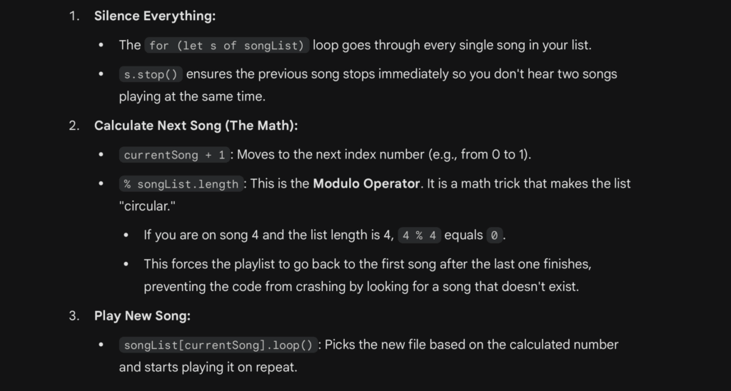 One part of my code that I am particularly proud of is the implementation of p5.js’s sound analysis tools, especially because we never learned these functions in class and I had to explore and understand them independently. I incorporated an FFT (Fast Fourier Transform) object and paired it with a p5.PeakDetect function. I configured with specific frequency and threshold values to isolate beats in the music track. By linking the FFT to the audio input and using peakDetect.onPeak(triggerBeat), I created a custom callback that activates whenever a peak is detected. Inside the callback, the triggerBeat() function sets sendBeat = true, which then sends a signal to the Arduino to toggle the LEDs in sync with the music. I am proud of this implementation because it demonstrates my ability to extend the project beyond what was taught, integrate real-time audio analysis, and create a visual LED effect using it.
