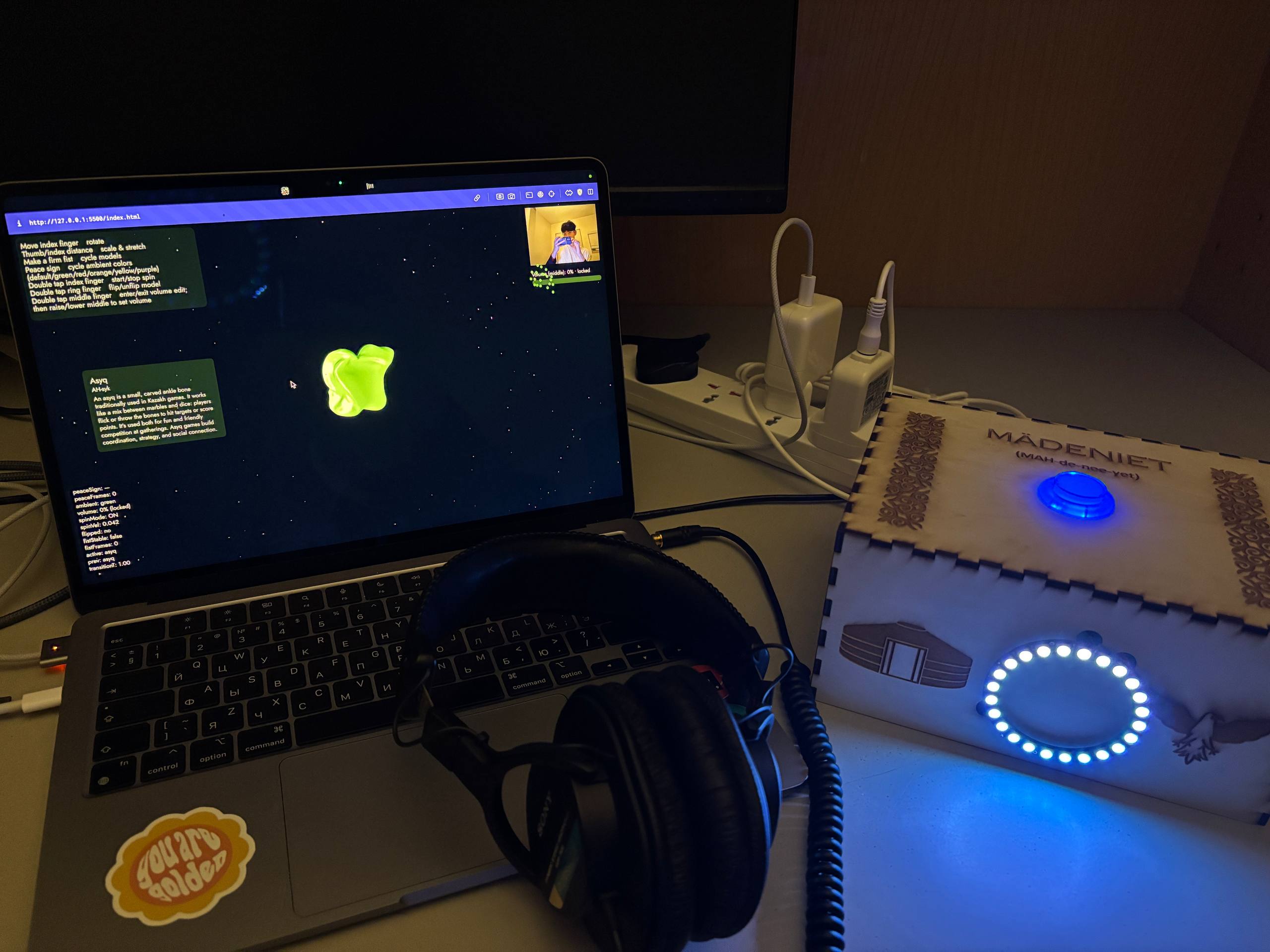 What parts of your project did you feel the need to explain? How could you make these areas more clear to someone that is experiencing your project for the first time? I think using a fist to transition between different 3D models is pretty cool idea, and I get to explore hand gestures more. I will try to make instructions constant on the page, in case user forgot, they will always be there. Also, in main menu I will try to explain a bit about the project itself. The project teaches people about Kazakh culture through interactive 3D objects. The user moves their hand in front of the webcam and controls a 3D asyq, kiiz ui, dombyra, taqiya in real time. Hand rotation and hand openness change rotation, scale, and animation of the models. The goal is to make cultural objects feel alive and playful. Handpose in p5.js finds key points on the user hand. The code maps these points to rotation and size values. The 3D models load from external OBJ files. The models update their rotation and scale on every frame based on hand movement. The interaction is simple so anyone can explore the cultural objects. The user brings their hand into the camera. Turning the index finger rotates the model. Bigger pinch between thumb and index distance makes the model grow. I want to implement moving the hand forward or backward changes the distance of the models. The idea is to mix physical movement with digital cultural storytelling. The Arduino sends arcade button state to. p5.js reads the values using the Web Serial API and starts the game. From p5.js to Arduino communication happens when user does a fist, then the 3D model changes and Adafruit Neopixel lights up a different color depending on which particular 3D model is on the screen. So far, asyq (blue), kiiz ui (orange), dombyra (red), taqiya (green). I am proud that the project takes Kazakh cultural objects and makes them interactive. I like that people can learn culture through movement. I am happy that the 3D models work smoothly with hand tracking. I used generative AI to help fix errors, structure the code, and write the description. All cultural objects are based on real Kazakh designs. I found 3D models online on Sketchfab, and I will reference them. I want to add more gestures for cultural actions like throwing the asyq. I want to add more Kazakh cultural objects. I also want to create a cleaner guide so visitors can learn the meaning of each cultural object.