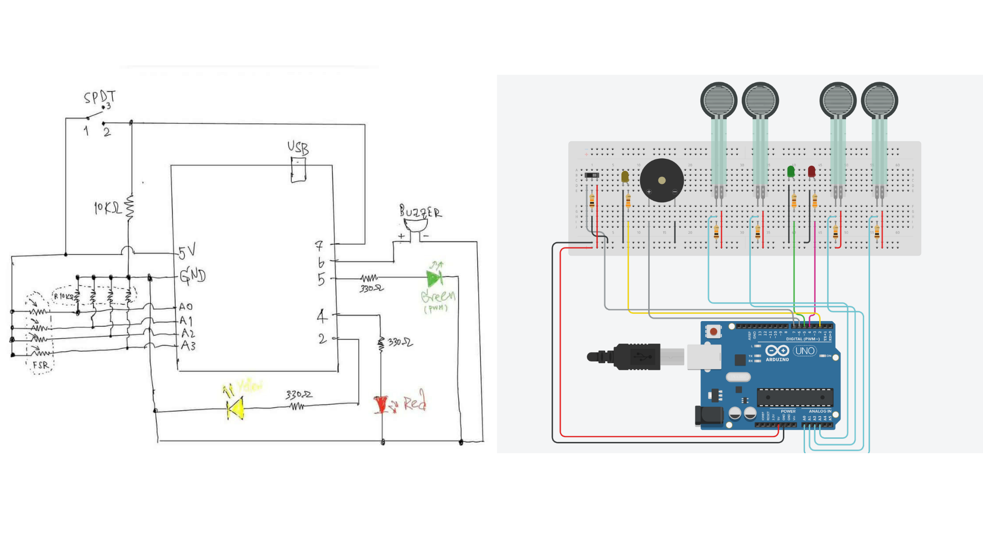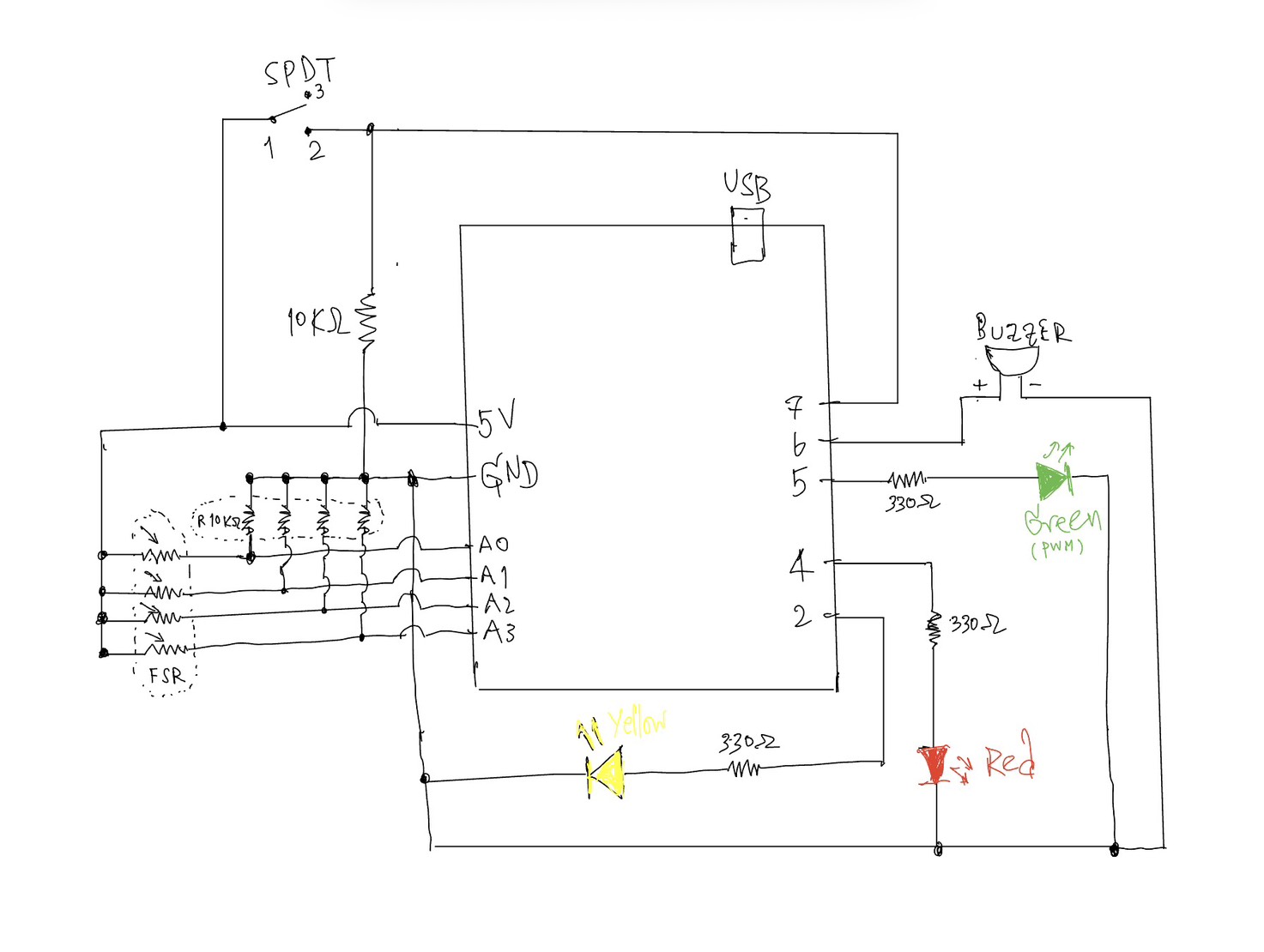 All FSRs are connected using a voltage divider with a 10kΩ resistor, and their values are read through analog pins A0 to A3. The system also includes several indicators: